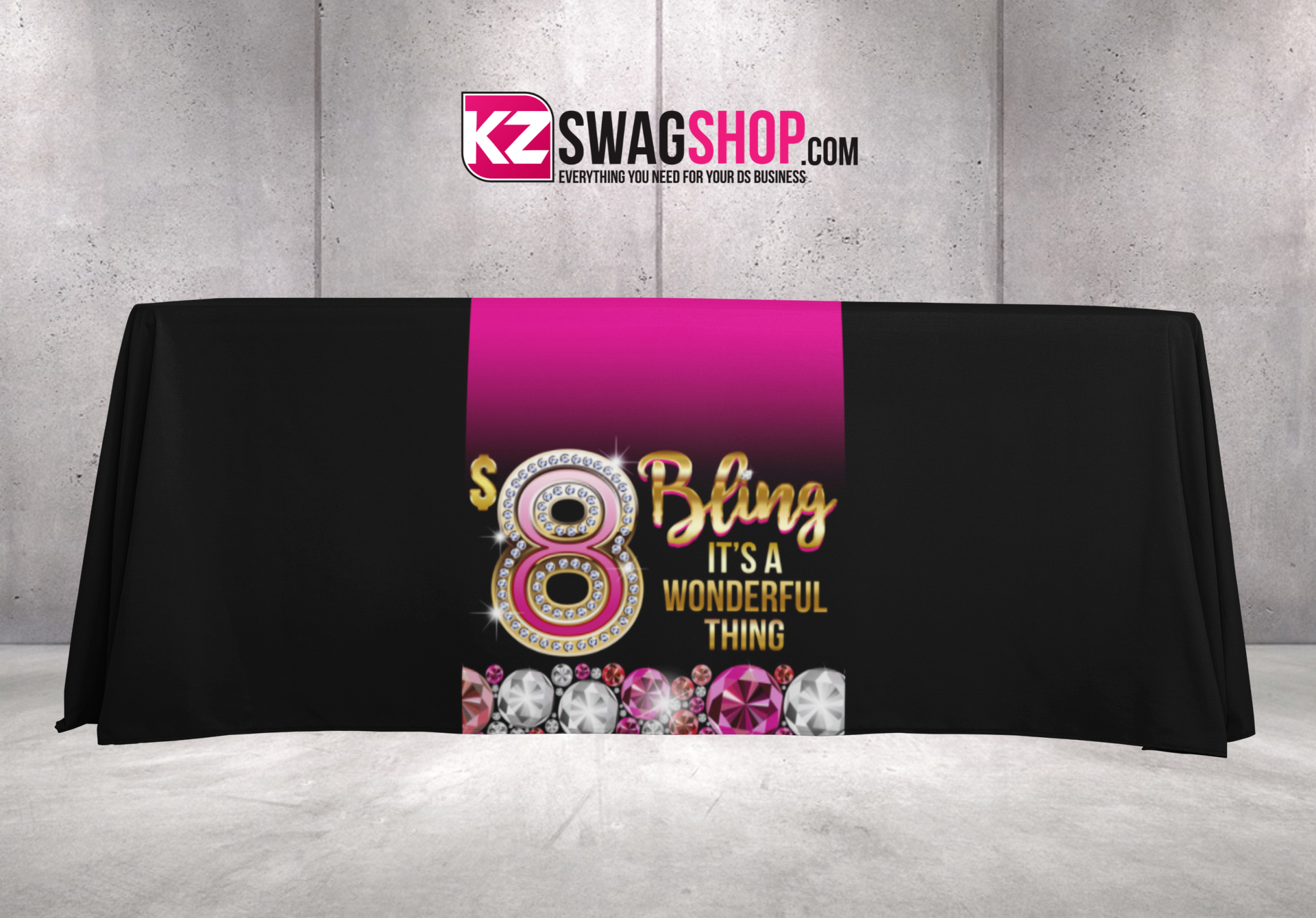 Our table runners are the perfect simple means to elevate your trade show booth with style and flare at an extremely affordable price. Our table runners are also very versatile and will drape over the front, top, and back of your trade show or registration event tables. Size 24"x72"