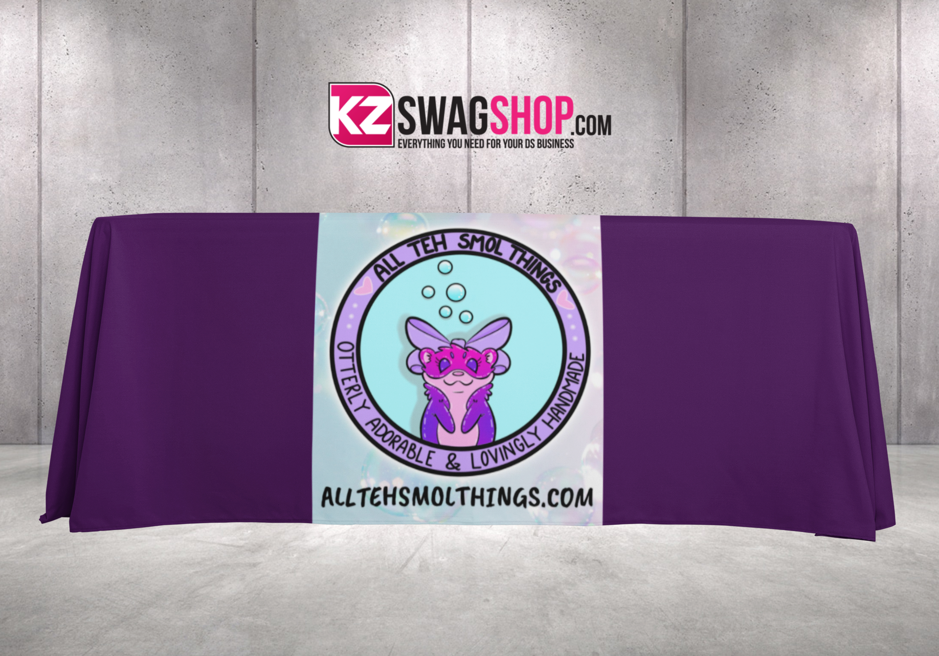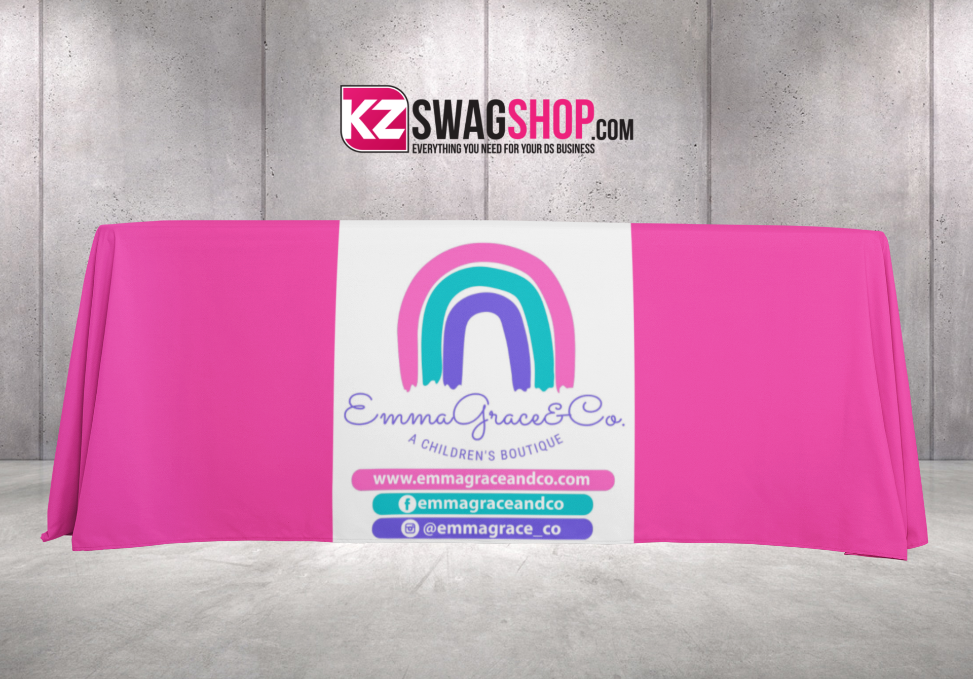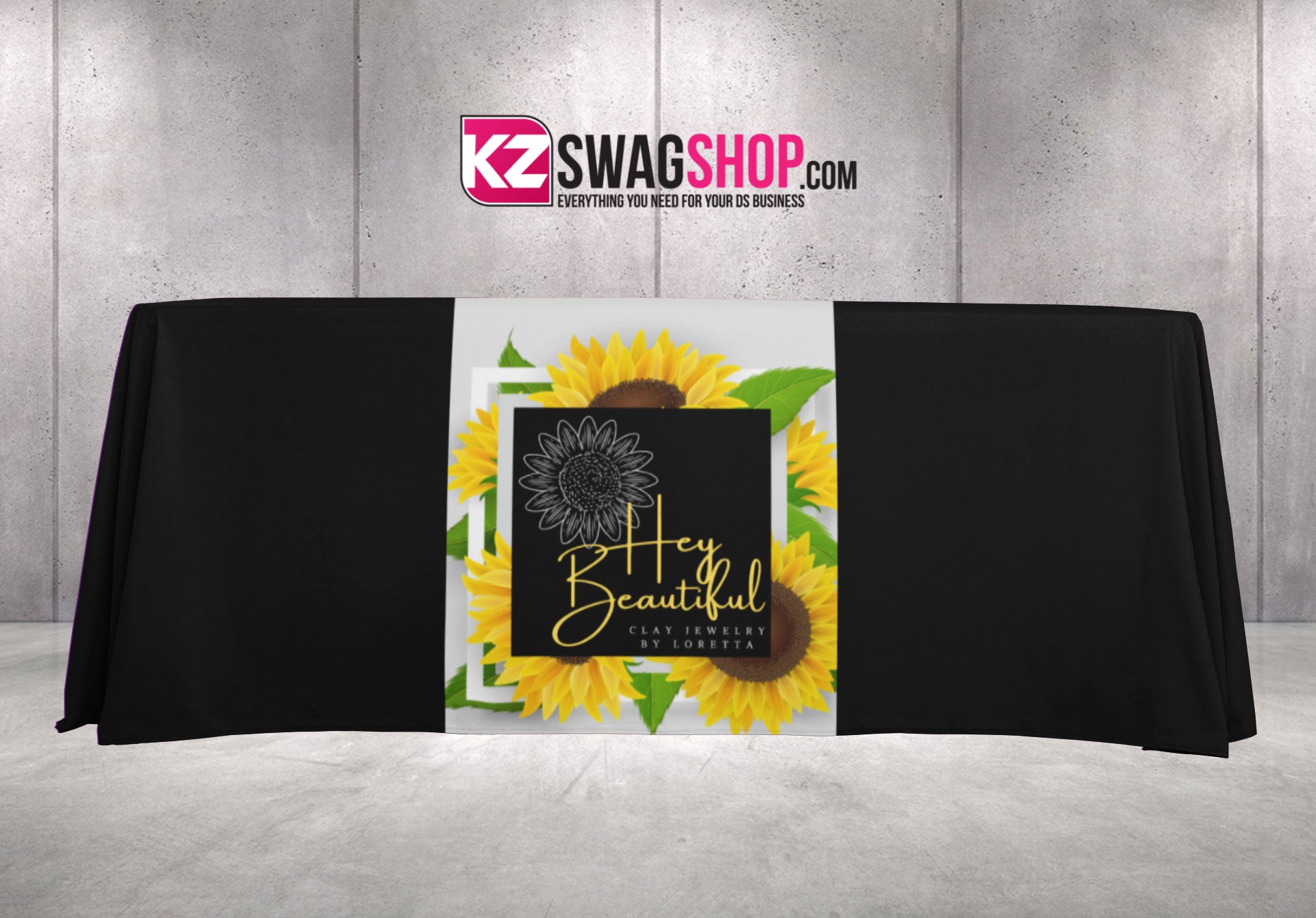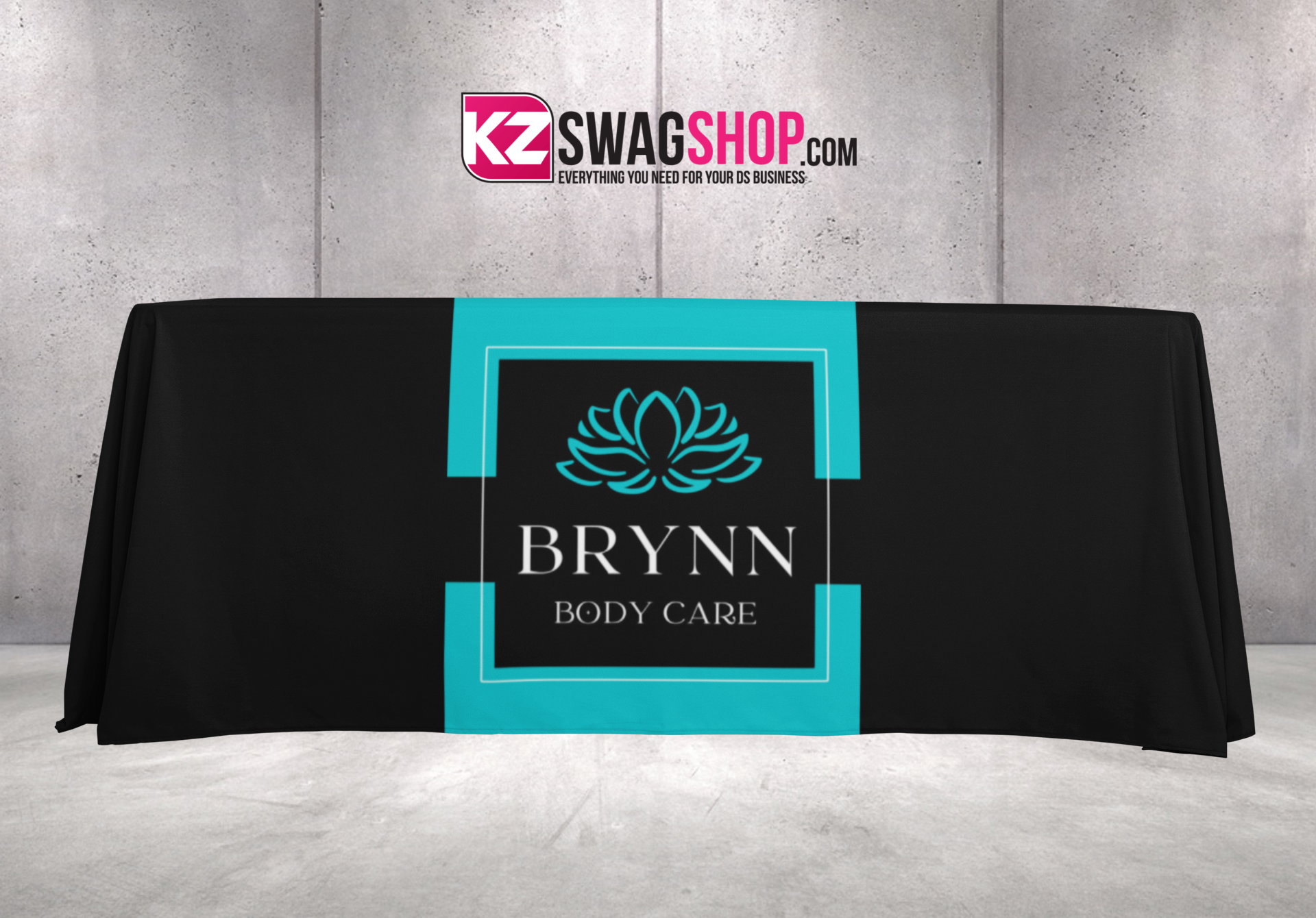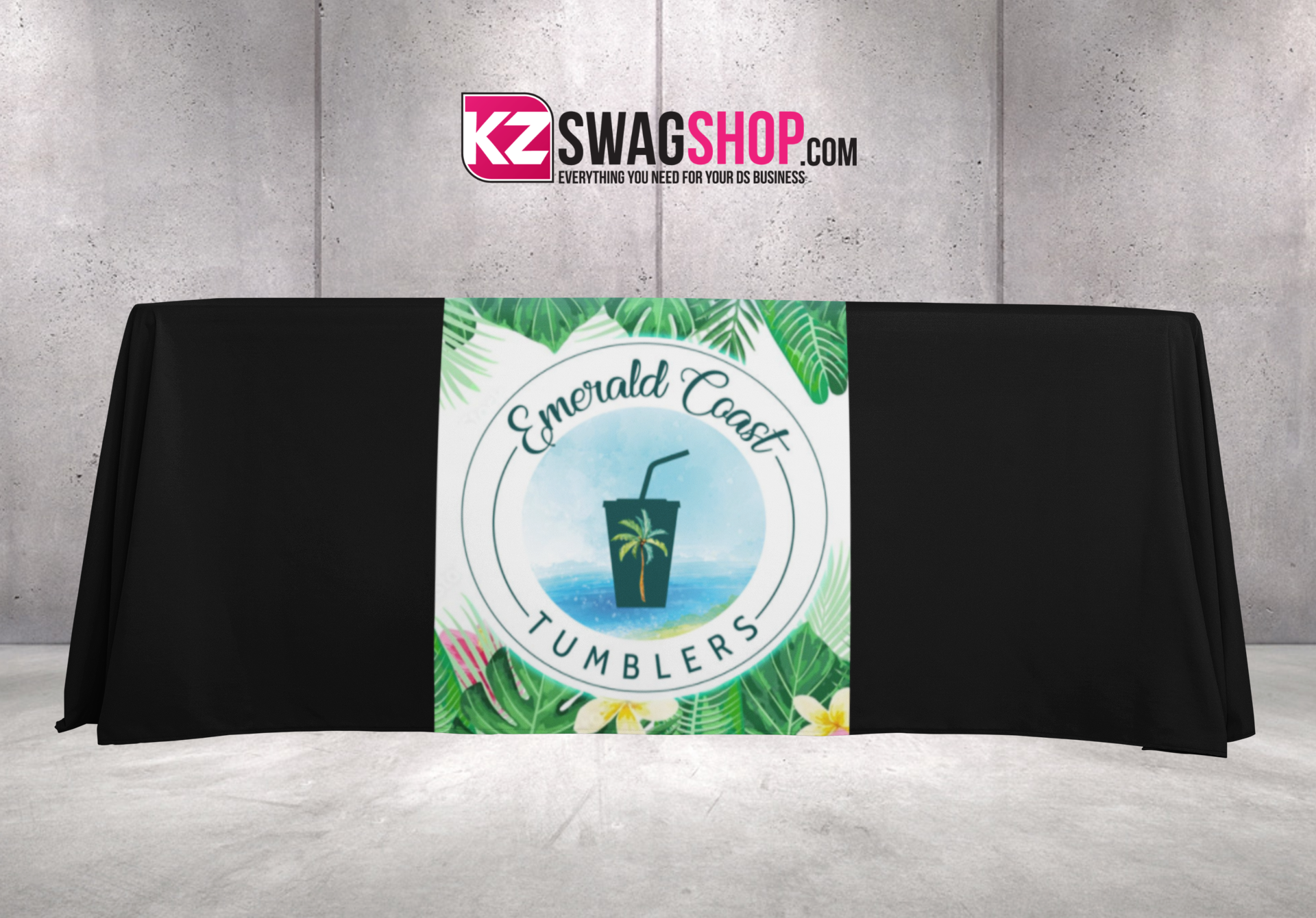 Our table runners are the perfect simple means to elevate your trade show booth with style and flare at an extremely affordable price. Our table runners are also very versatile and will drape over the front, top, and back of your trade show or registration event tables.