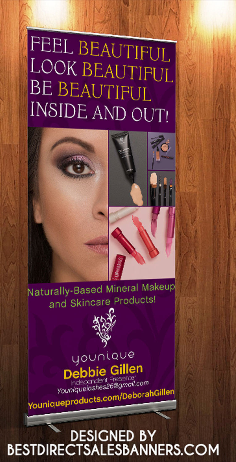 Showcase products and services with our retractable banners, which are specially made for Younique Consultants! These attention-getting banners are lightweight and portable, so setting up a winning presentation is easy! Included with this Younique Retractable Banner style 2 is a banner insert, retractable stand and a carrying bag. When not in use, this 33" x 81" banner retracts for storage in its aluminum casing.